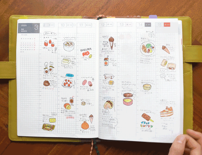Before, she often took photos of the snacks on her smartphone, but by actually writing and drawing it down in her techo, she finds it more fun to look back on and last in her memory better.