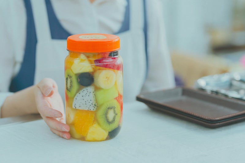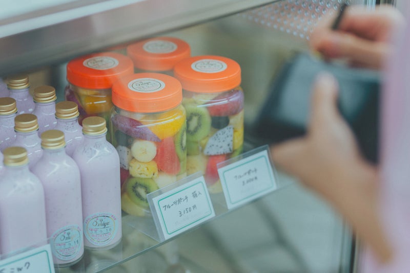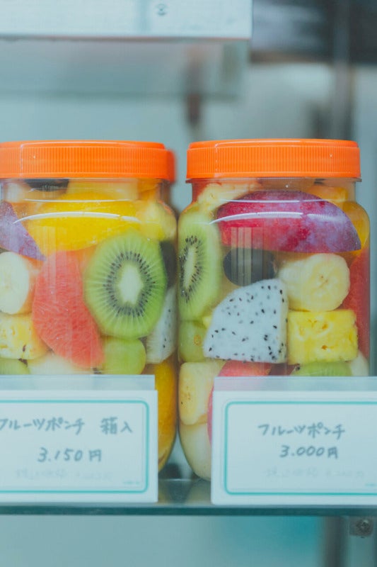 Fruit punch that is packed in a large jar. It easily has portions for 4 or 5 people. The fruit depends on the season, but it always includes 10 to 15 of that seasonfs produce. The tang that comes from the largely cut fruit matches the smooth sweet syrup. Itfs a classic item of Omiya Yogashiten.