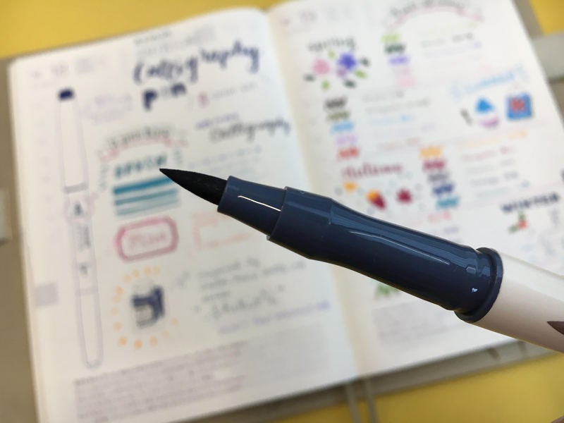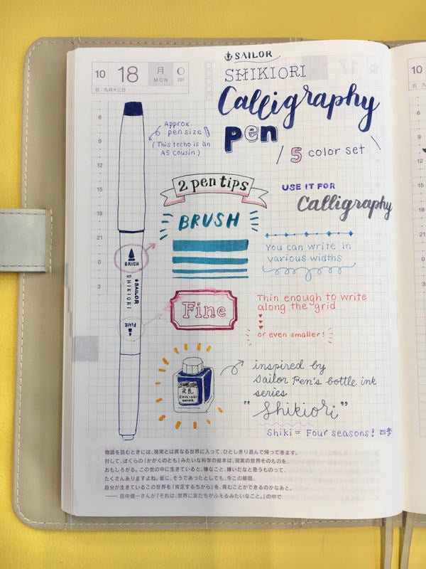 The brush pen isnft too gsofth (or is it better to word it squishy?) so itfs useful both when you want to do calligraphy or when you want to color in illustrations. Lay the pen flat or apply pressure to draw thick lines, and hold the pen upright and release the pressure when you want to draw thinner lines. The fine tip on the other hand is really firm and I feel it doesnft get squished as you use it. (There are some pens where the pen tip gets squashed when you write with high pressure, so this is a big plus for me!) That means you can keep on writing thin lines throughout! This is perfect for writing along the grid of the techo paper.
