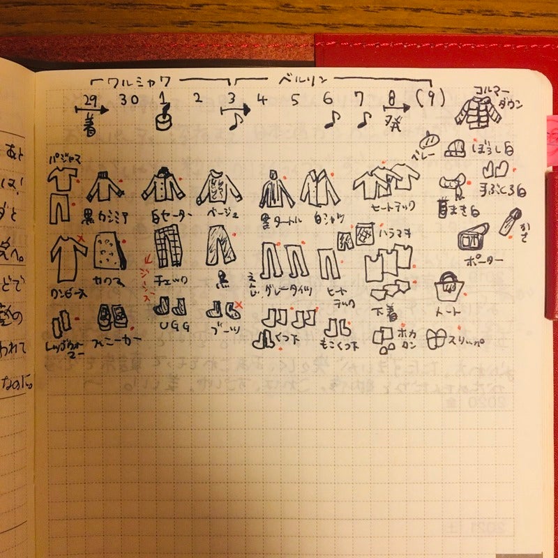 By writing it down, it becomes a handy reference for when I travel next, and I find it super useful. I also have another page where I write down outfits for each day. (This memo was for when I traveled to a place where it was said to be -15 degrees for the first time in my life, so I prepared for it extra carefully.)