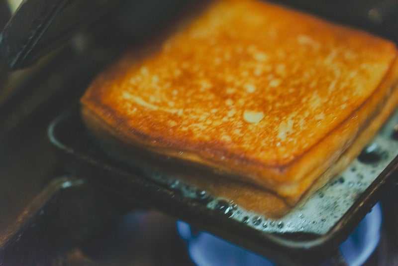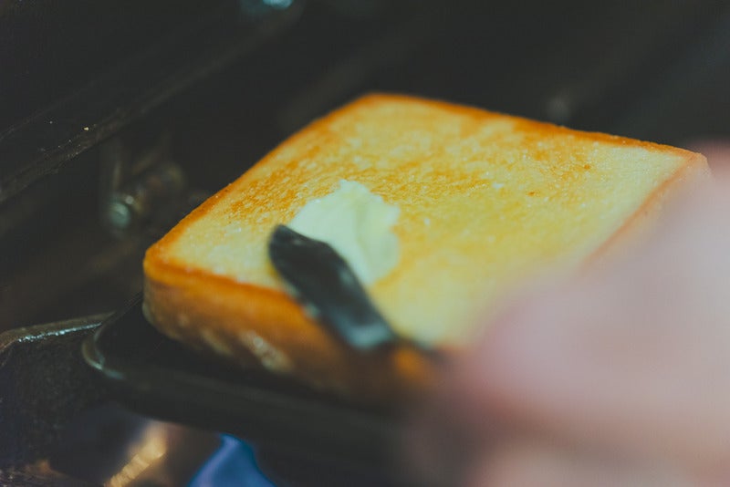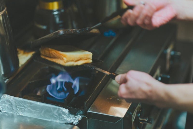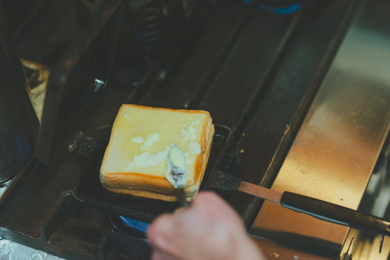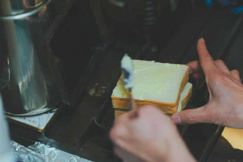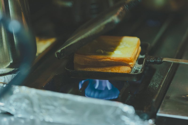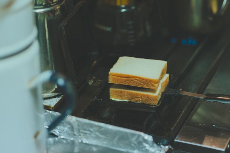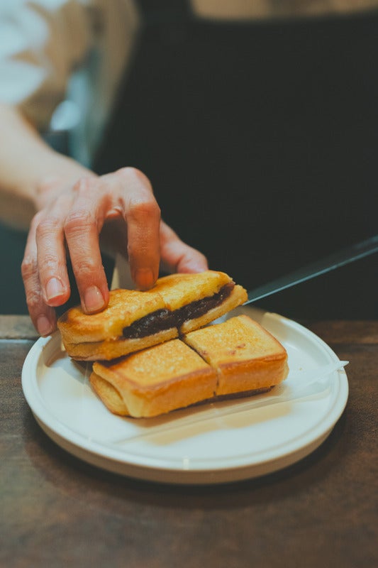 Uses shoku pan (white loaf) from Suzuki Bakery, who they have known each other for over 50 years. Itfs sandwiched with anko (red bean curd) and toasted gradually by adding lots of salted butter. Chief Sasaki came up with this idea.