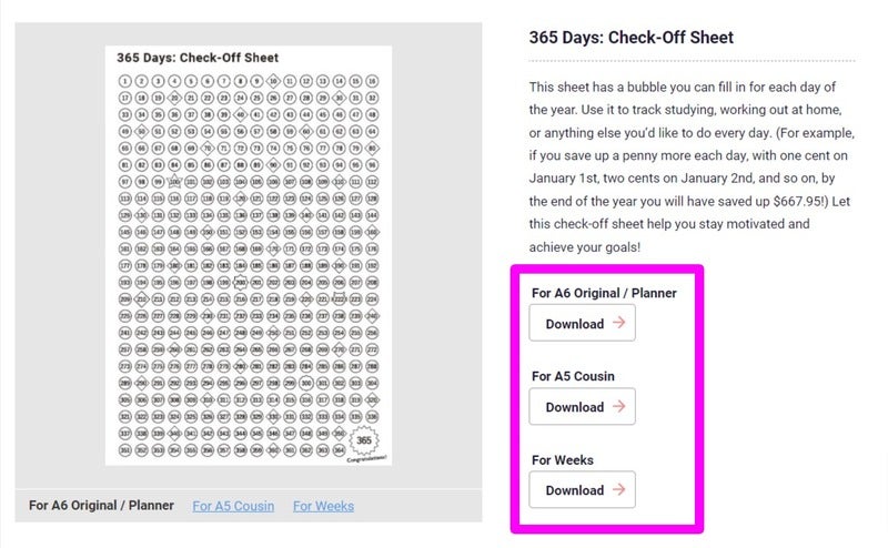 This is the 365 Days: Check-Off Sheet (for the Planner/Original size).