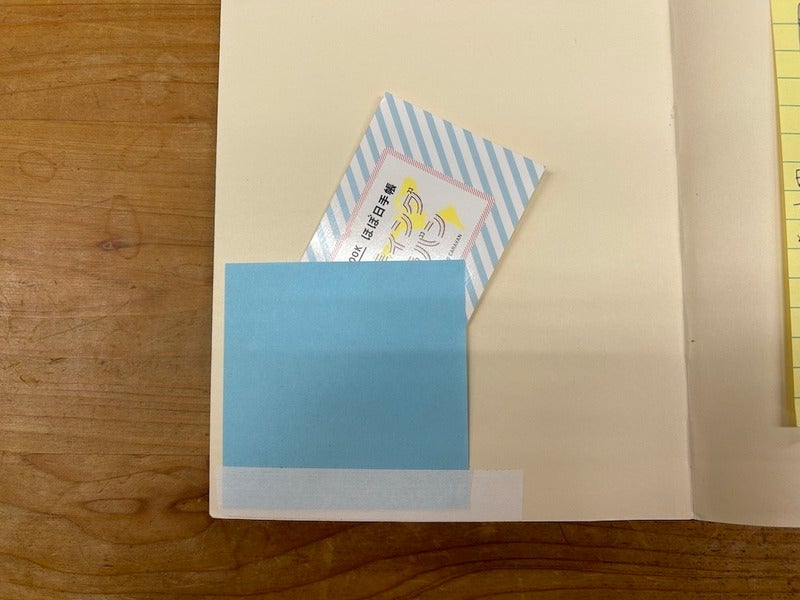 I use this when coming up with project ideas by brainstorming and scribbling in it, but I wanted a small pocket to store things in so I scrapped together a homemade pocket using a sticky note.
