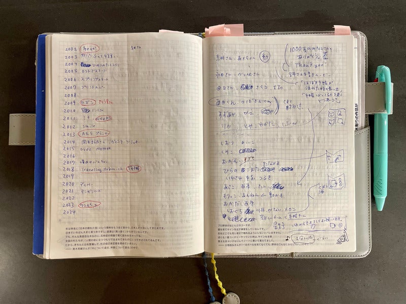 ^She uses one page of the memo pages per meeting. Herefs a memo from when she looked back at past techos and the techo team for the Hobonichi Techo 10-million sales project.