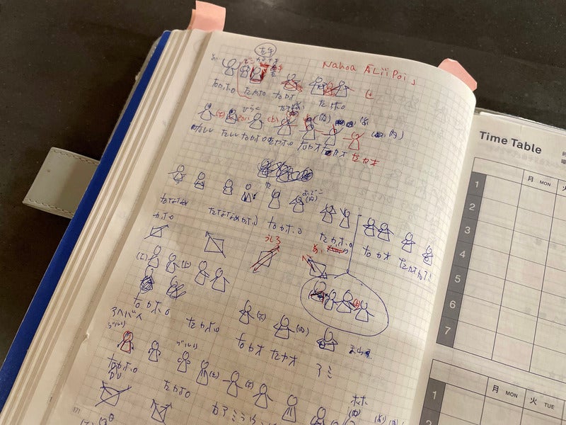 ^A memo of a choreo for hula dancing when she forgot to bring her notebook.