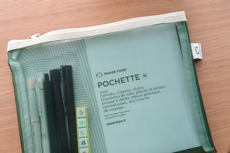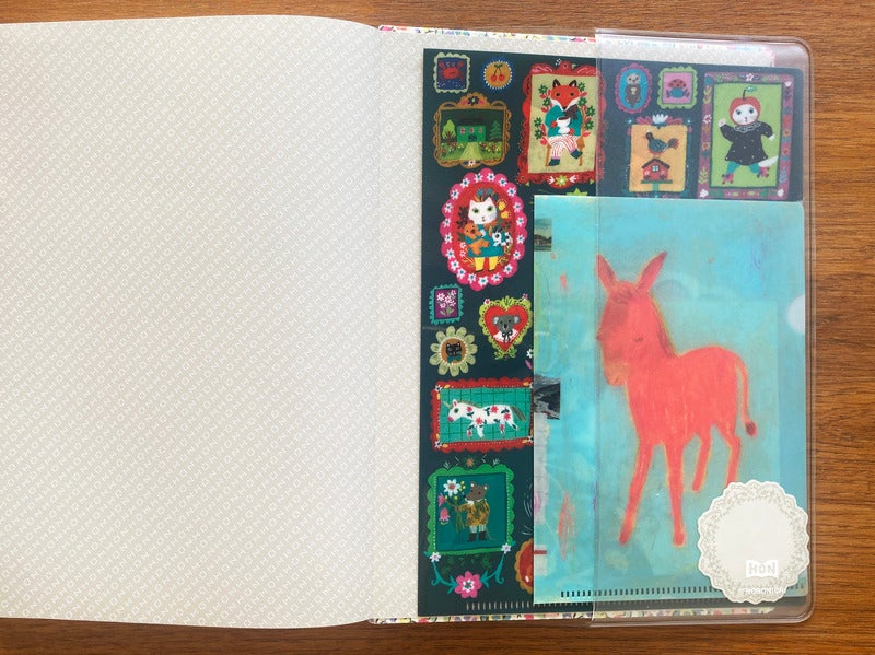 Other than the pens I carry with the techo cover, I keep a few Mildliner pens in the Small Drawer Pouch.The color combination of the illustrations by Hiroko Kubota and the Mildliner are cute.