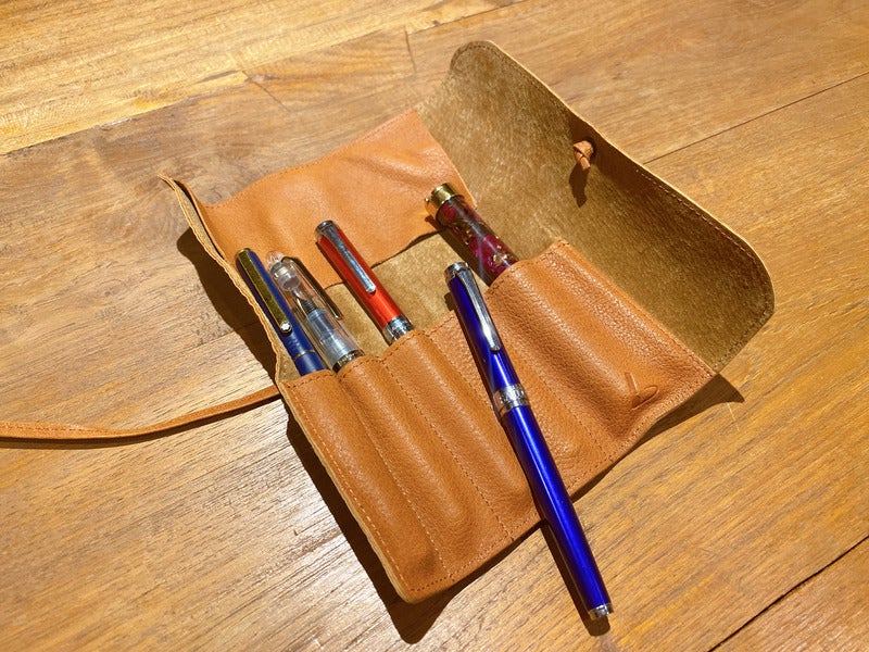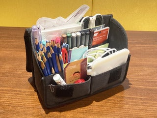 Watanabe uses a Stappo Black to store colored pencils, Copics, and other pens. The large inner pocket can hold Copic markers by their clips for easy access.