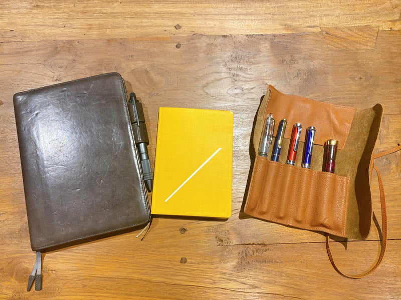 The pen I use is the Hobonichi Store exclusive Jetstream ballpoint pen and the Mildliner in mild gold. I use a Rivet Band Laccio so that these two pens donft go missing.