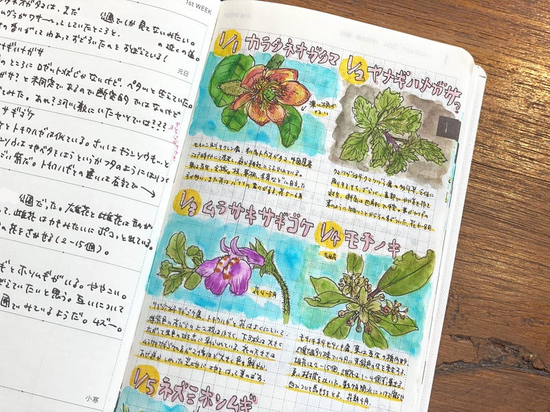 I found a dandelion while I was on a walk and kept it for my diary. By drawing a matching yellow line to the corresponding words, the page feels more organized.