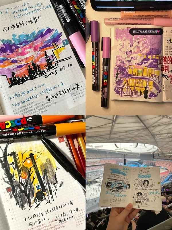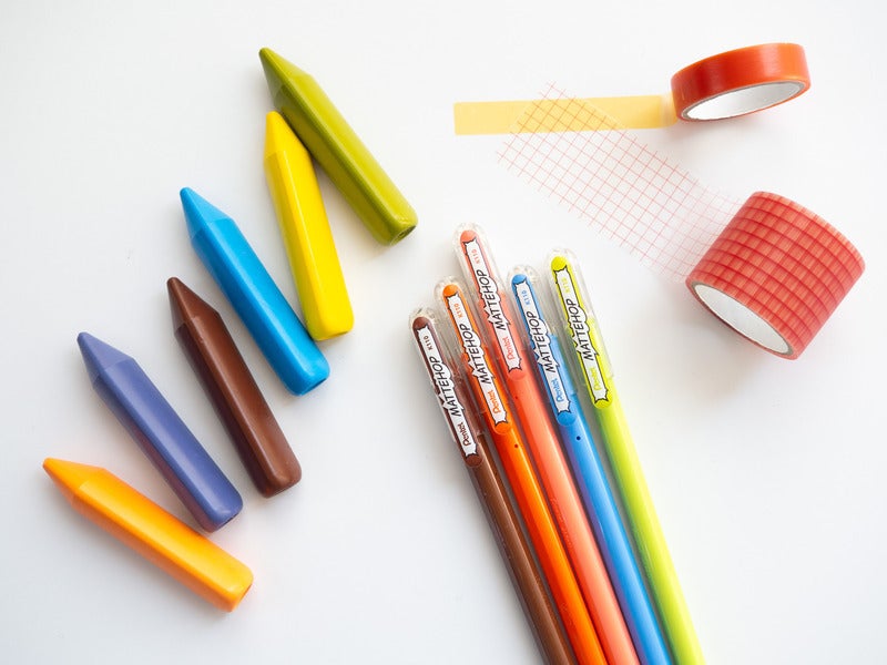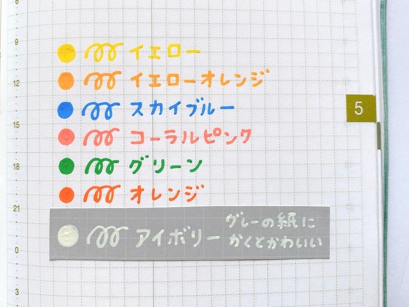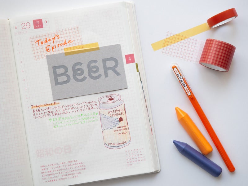 The ink of these matte color ballpoint pens writes so deep and vibrantly that itfs almost like youfre painting with it. Writing on dark-colored paper or photo paper gives it a strong sense of presence. I often have a hard time getting myself to colorfully decorate things, so I made it a little less intimidating by starting with washi tape for my journal entry headers and then wrote on that!