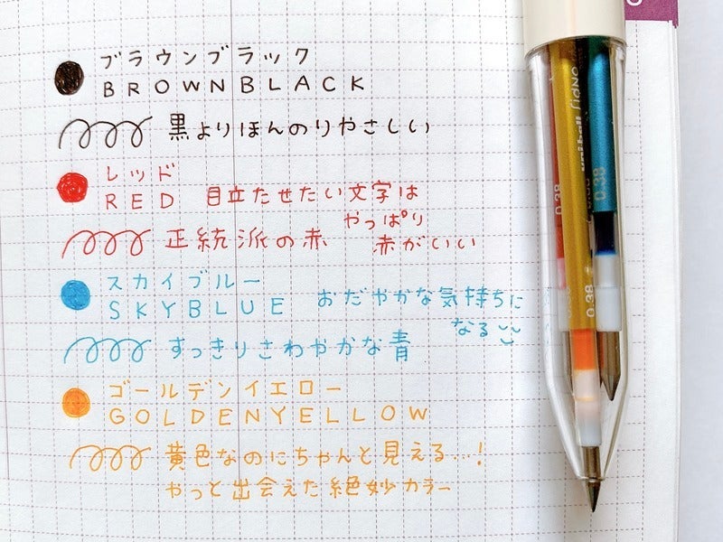I feel like 5-color ballpoint pens are relatively rare. (It comes with 10 refill colors and you make a set with 5 at a time.)