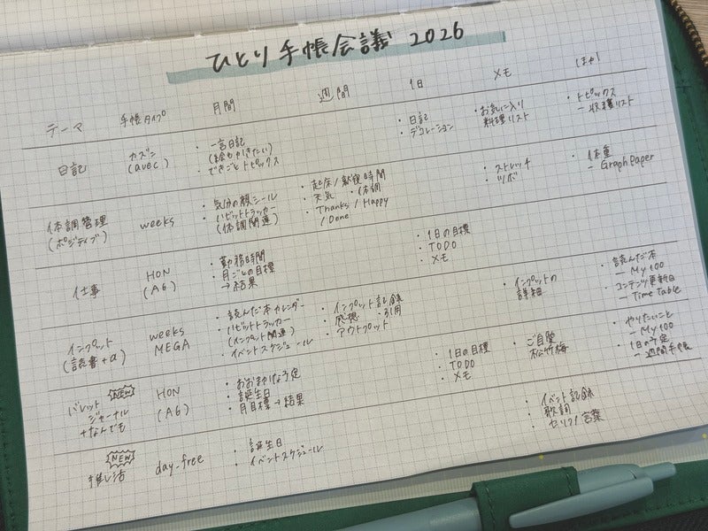 Every year, I usually just pick whichever techo feels right at the time, so this is actually my first proper Techo Kaigi. I started by reflecting on how I used my techo in 2025 and thought about how Ifd like to use it next year, noting down whatever came to mind. My reflections are on the left, and on the right are photos of the techos I want to use and how Ifll use them.