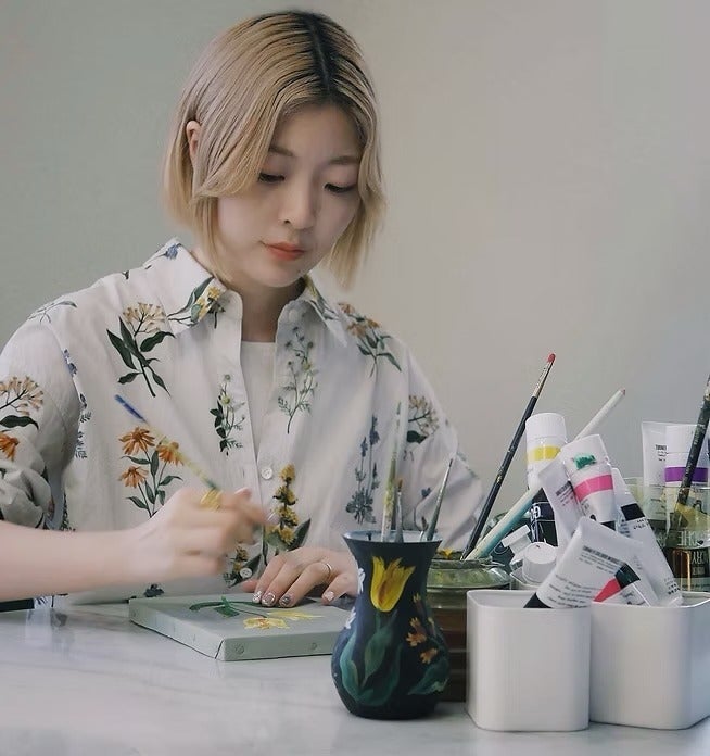 Aoyama explains: gThe beginning was during the stay-at-home period of the pandemic. I felt very low at the time, and wanting to feel even a little brightness or hope, I drew a flower on a wine glass I was about to throw away and displayed it. Flowers are a universal, timeless motif that anyone—regardless of age, gender, or country—can feel close to. Ifm drawn to the way they seem to hold the warmth of sunlight within them.h