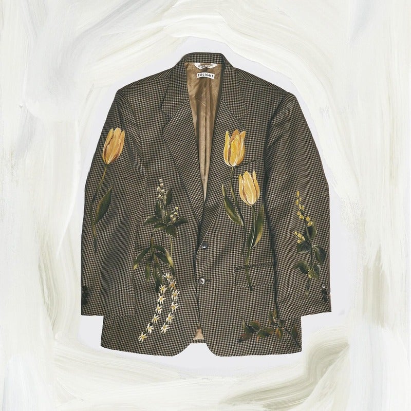 Herefs a one-of-a-kind used jacket with plants painted directly onto it in acrylic. The delicate yet vibrant botanical artwork adds a wonderful sense of depth to the chic, dark-toned jacket.