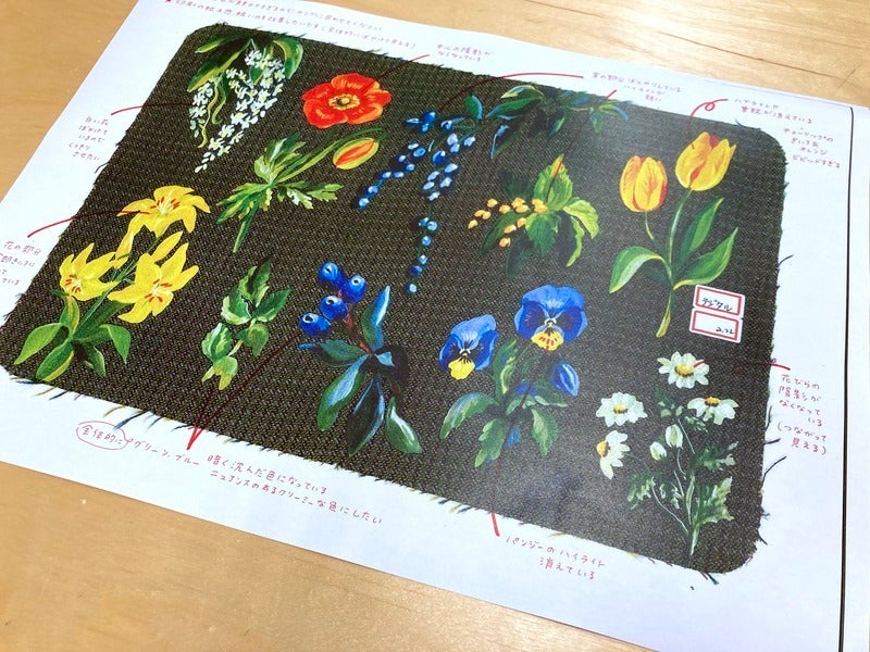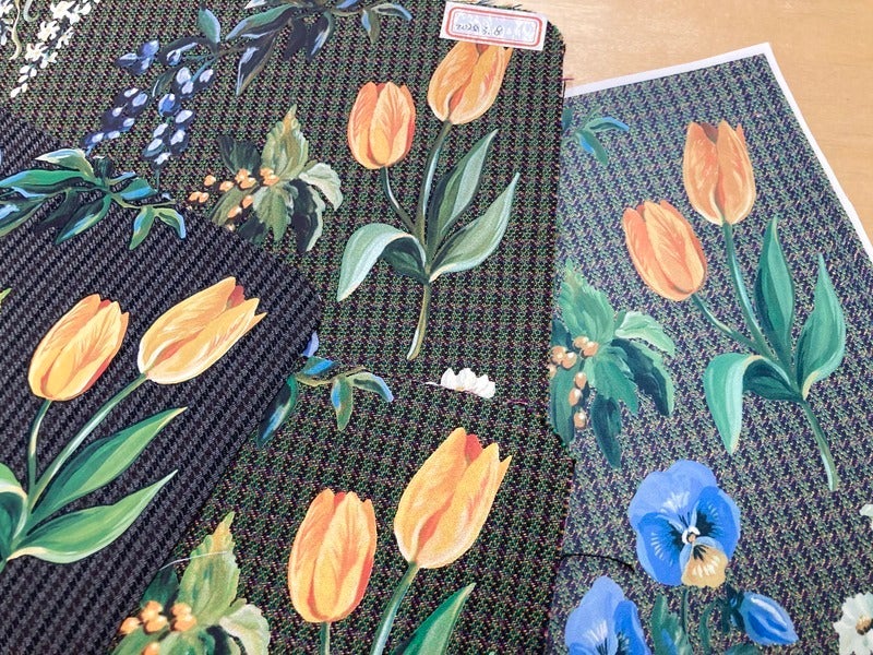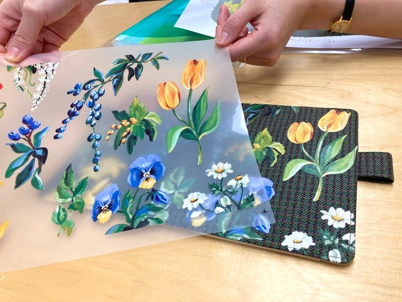 gI tried combining the fabric and illustration data, testing prints that blended more with the material, and many other methods. After a lot of trial and error, we arrived at a glossy printing method that really brings out the texture of the flowers.h