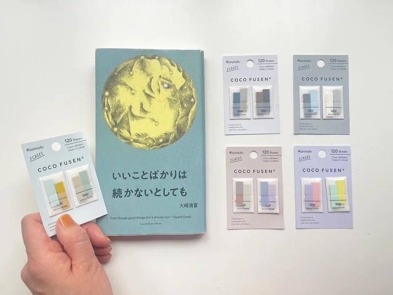 coco fusen is a series of film-based sticky tabs that come pre-set in a small case. The back of the case is made of a material that can be peeled off and reattached, so you can stick it right onto the cover of your book.
