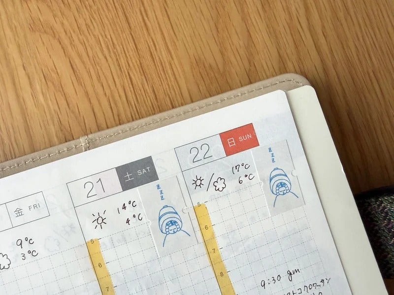 Ifm still thinking about how to use them all, but Ifve decided to paste this gZzzh sticker on my life log page on days when I sleep for 7 hours. Ifm the type of person who needs proper sleep, so Ifm hoping that the desire to paste these stickers will stop me from staying up too late. Itfs the same logic as the stamps you get for doing radio calisthenics during the summer vacation. The laid-back style of the illustrations is also irresistibly cute.