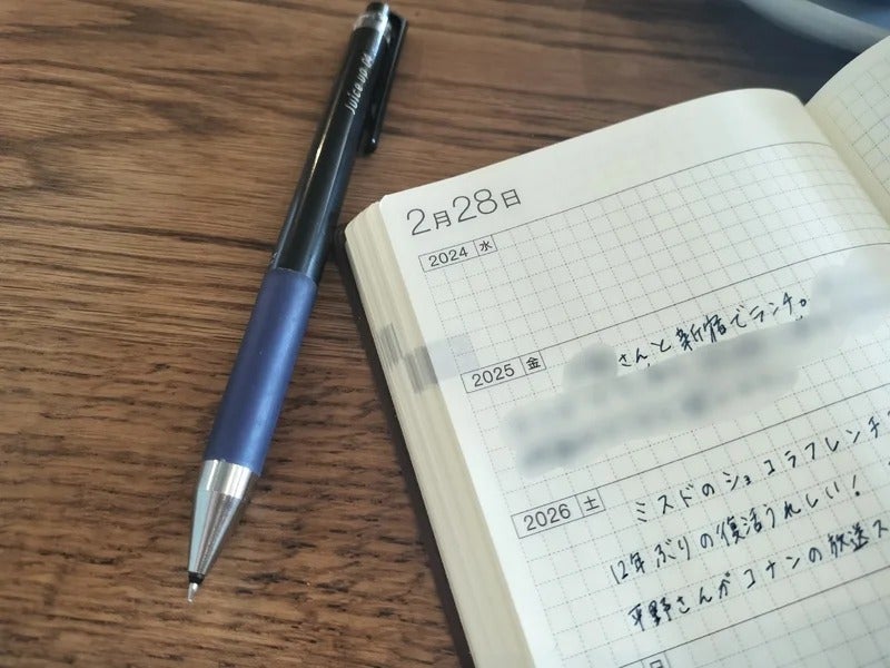 Because the space for each day in the 5-Year Techo is on the smaller side, this fine nib is just right. Itfs water-based, writes so smoothly, and I feel like it doesnft bleed through very much, either. I once had a great time chatting with
