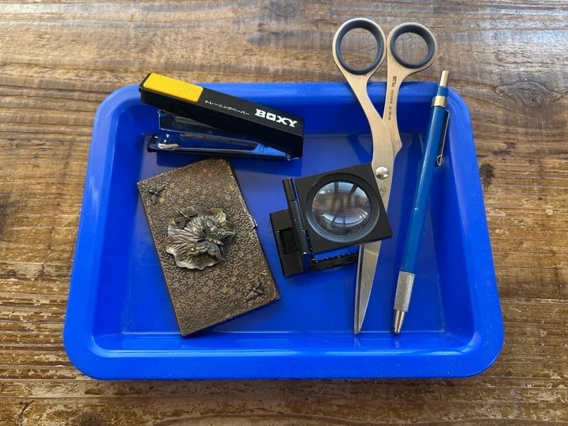 Ifm obsessed with my old stationery too. This was the stapler and magnifying glass I bought when I first headed out to work. A stylish but slightly difficult-to-handle business card case I inherited from a senior colleague. This Staedtler mechanic pencil and pair of scissors were bought because a designer I admired used them. These are all items Ifve been with for over 20 years, and I just can't let them go.