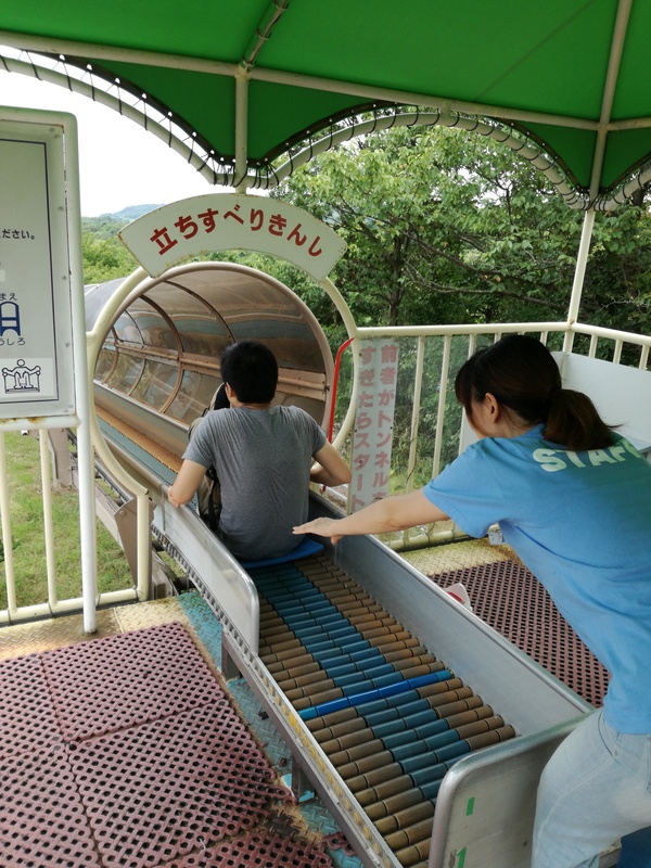 とうじがお姉さんに背中を押されてすべりだいをすべっていきます。