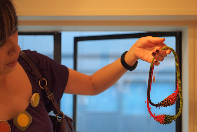 これはことし銀座で開いた個展のひとこま。手に取って、つけて、選ぶ。