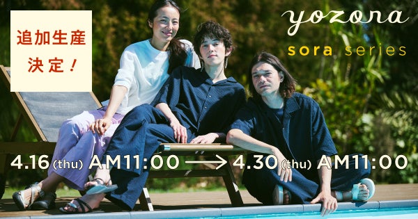 先日の予約会で完売したカラーについて、追加オーダーを承ります!暑い夏でも極めて快適なsoraシリーズを、ぜひお試しください。お届けは、「4月下旬〜5月上旬」または「7月中旬」です。アイテムごとに異なりますのでご注意くださいね。