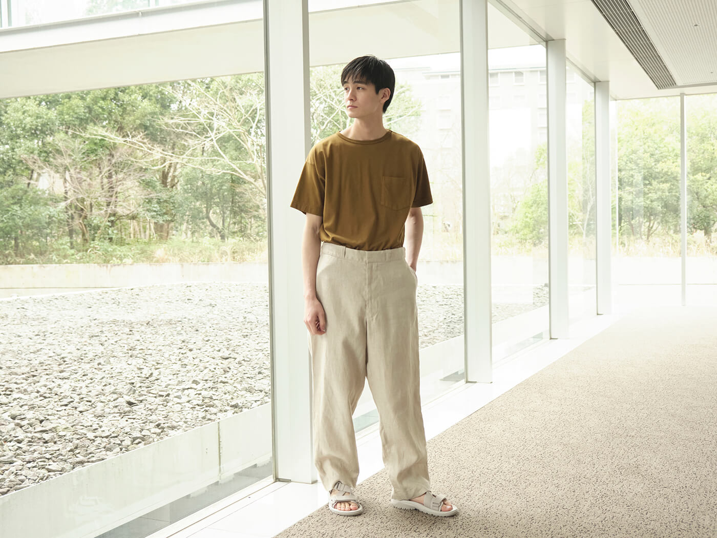 白のパンツをタックインして清潔感のあるスタイルにしました。
