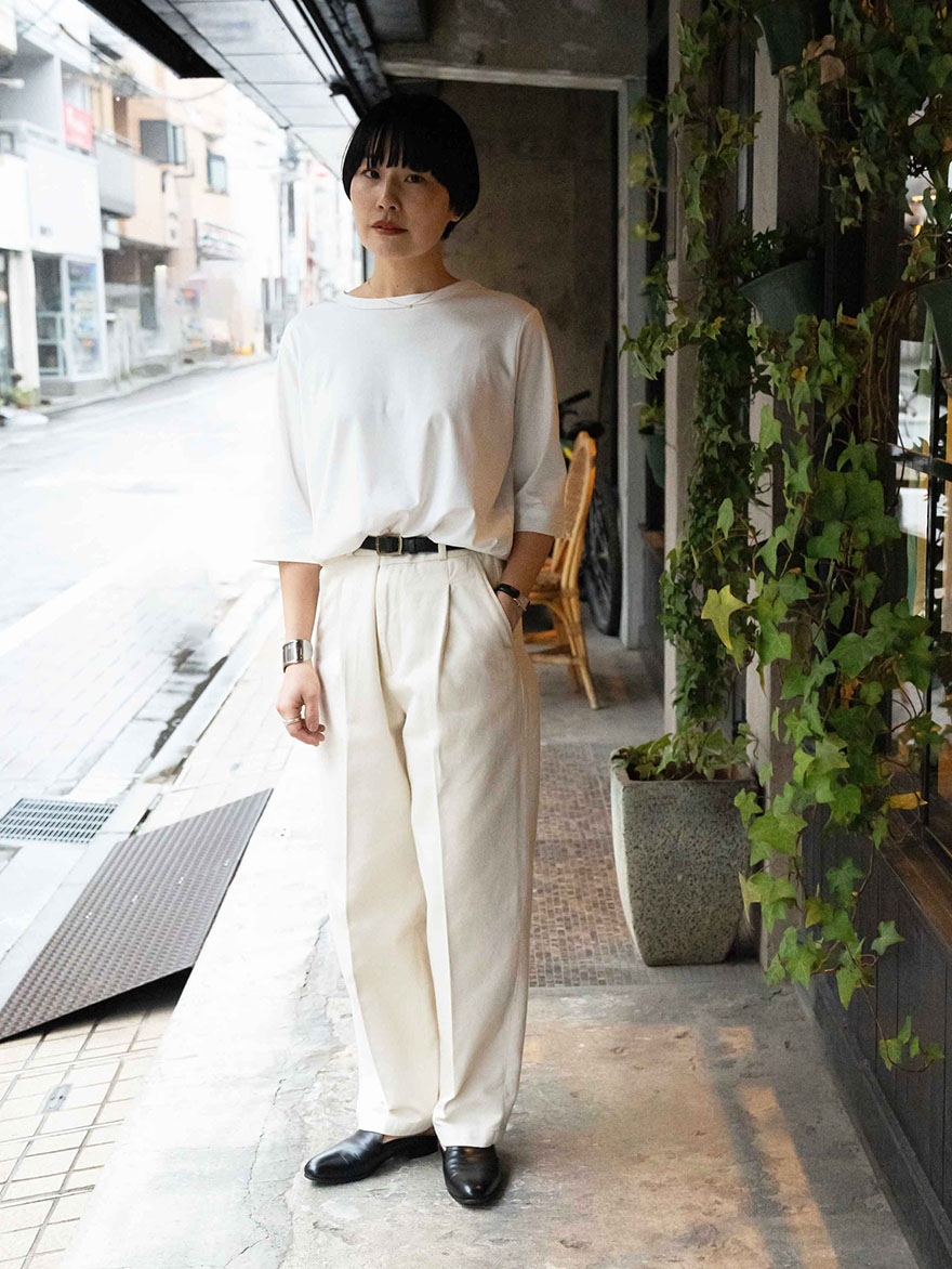 タックインしたほうがTシャツのかたちがきれいに出ます。