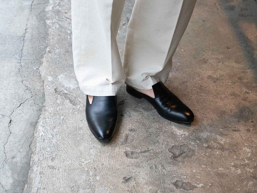 足元にブラックのレザーシューズ、