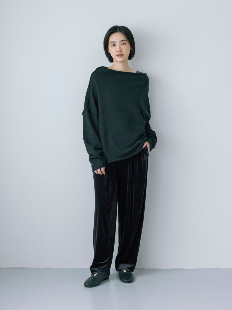 ベロアのお洋服は、ぎらっとした光沢感の強さが苦手で あまり着てこなかったのですが、 「コンフォートドレスパンツ」は、光沢感を抑えるために あえて「逆毛」にしているというのを見て、 買ってみようと思いました。