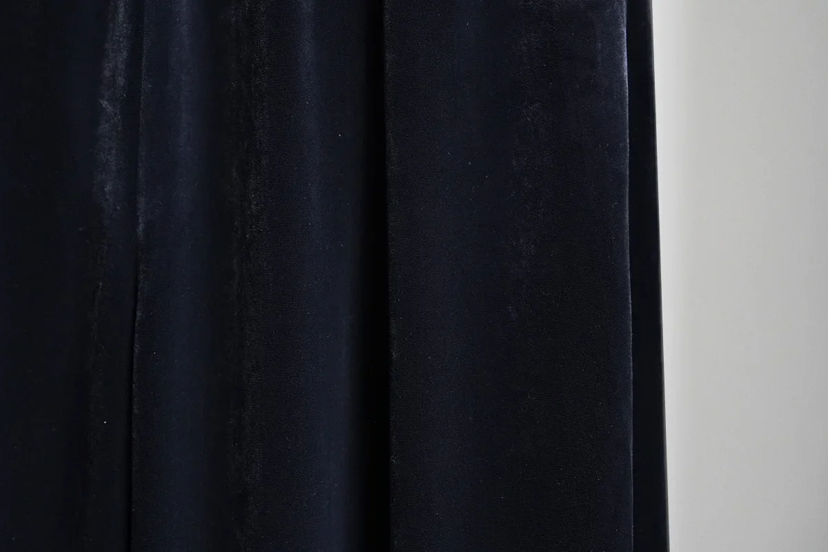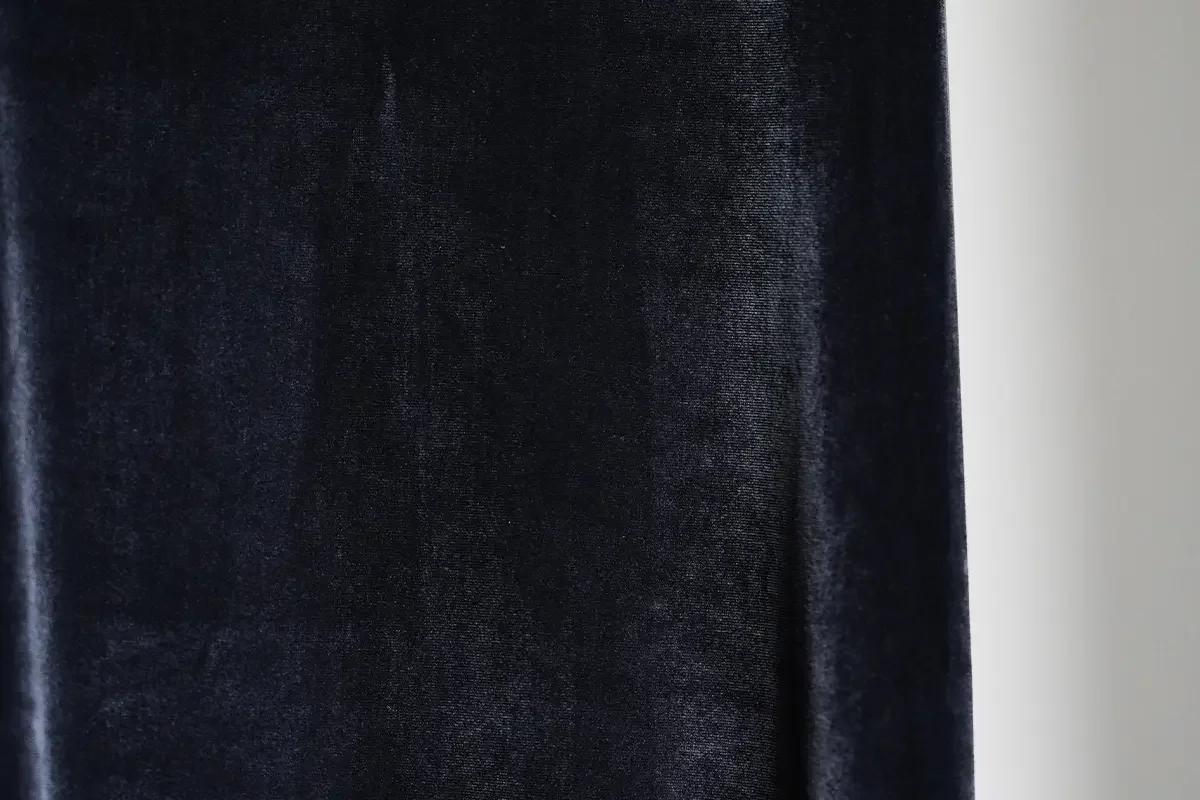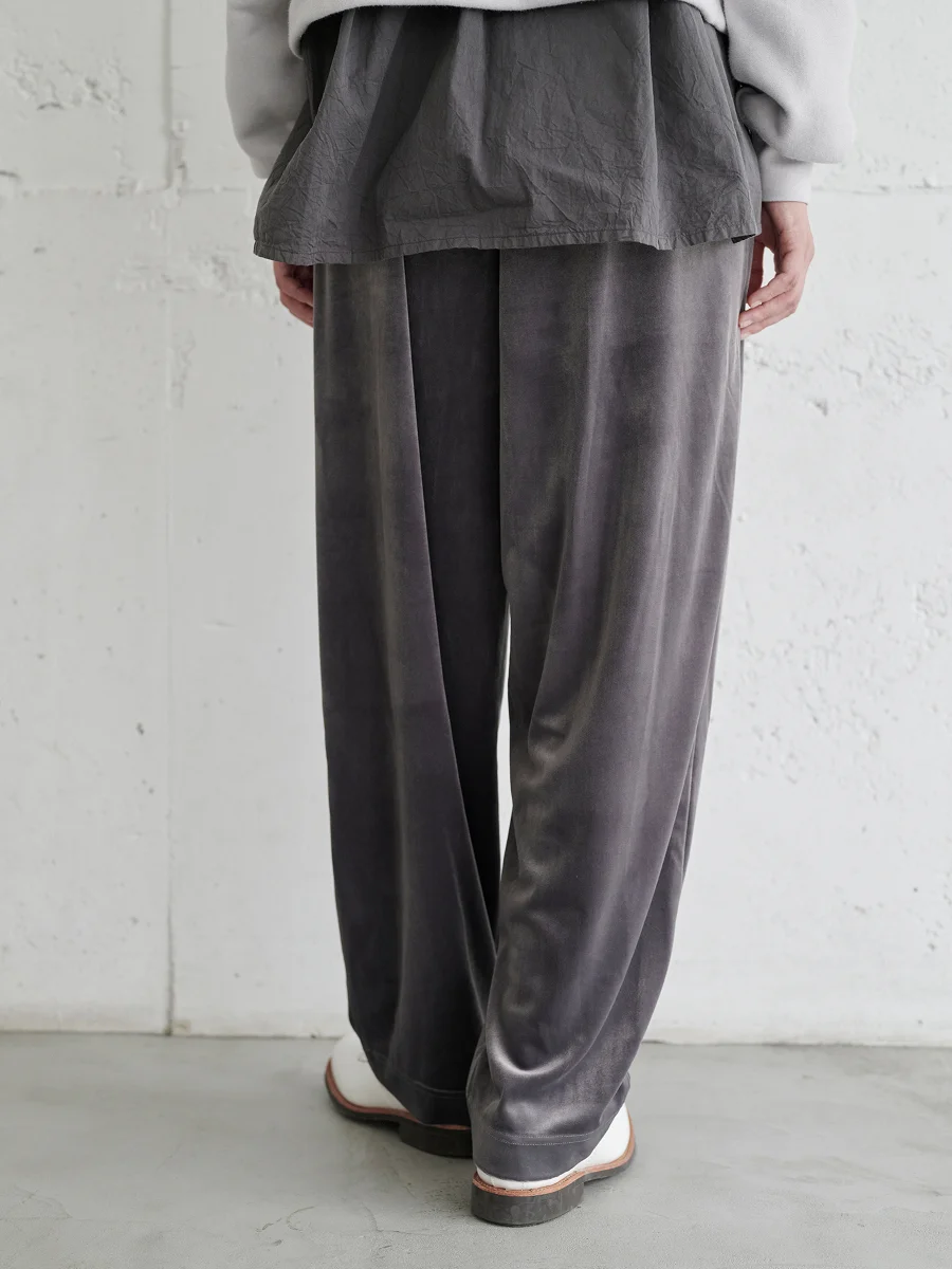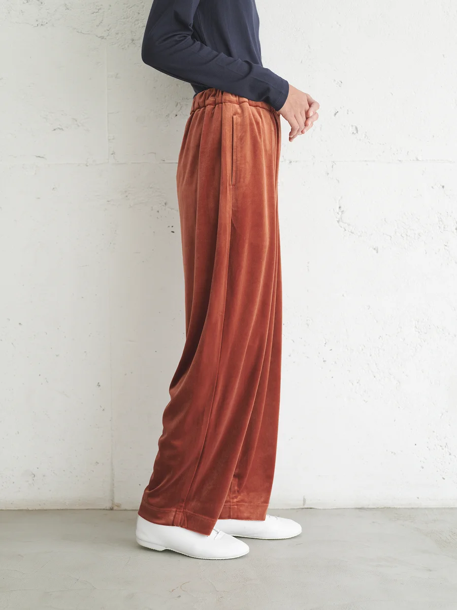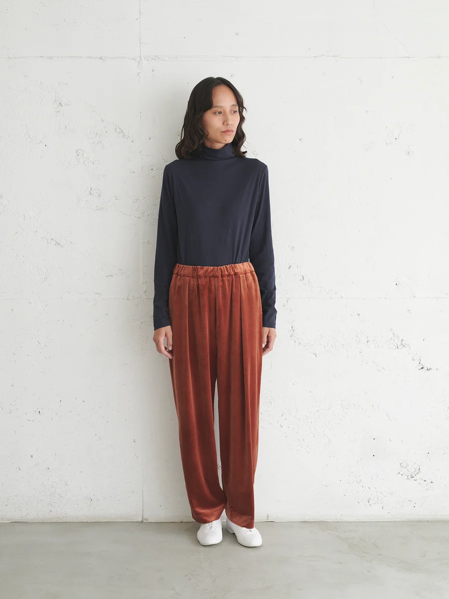 ラインがきれいなので、トップスはカジュアルでも、 ちょっときれいめでも受け止めてくれる。 合わせる靴も、スニーカーからローファー、 バレエシューズ、ヒールまで なんでもしっくり馴染んでくれる。 ベロア素材ですが、落ち着いた光沢なので 華美になりすぎない。