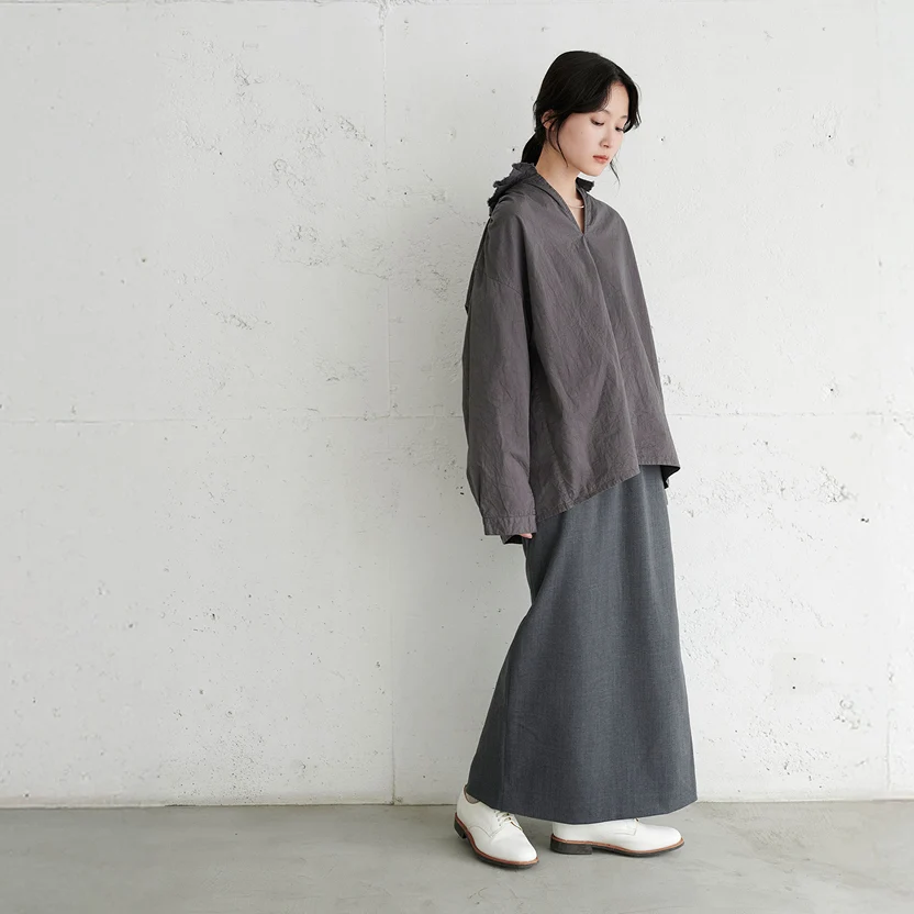 今年は、その人気に応えて、定番のブラックに加えて、 新色スチールグレーとテラコッタを追加。 さらに、パンツと同じく、 快適さと上品さを兼ね備えたスカートも制作しました。 どちらのデザインも手がけてくださったのは、 「GRANDMA MAMA DAUGHTER」のデザイナー・ 宇和川 恵美子さんと、「KATO’」創設デザイナーの 加藤 博さんのおふたりです。 自信をもって「コンフォートドレス」と冠した パンツとスカート、 どちらも〈O2〉の秋冬の新定番ボトムスとして、 きっと毎日の装いを支えてくれるはずです。