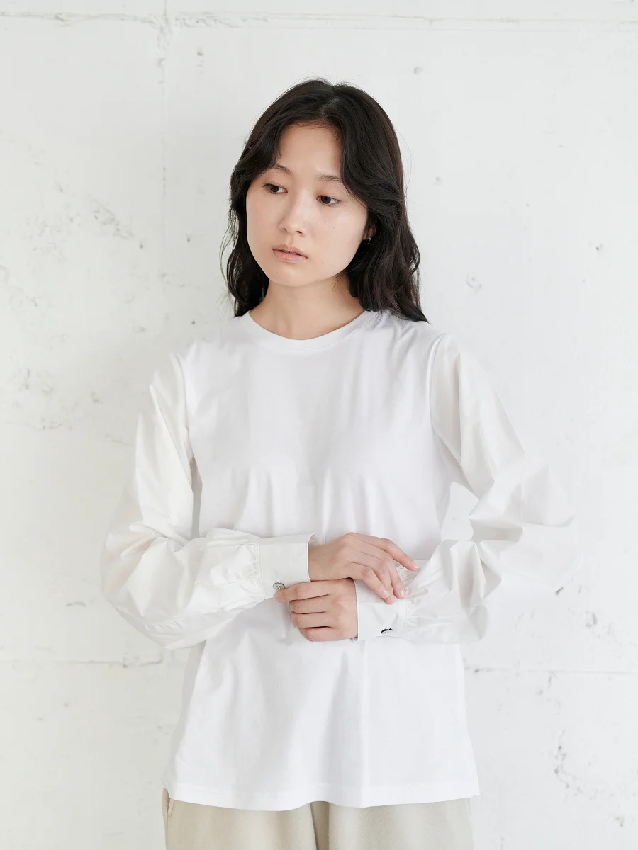 この冬はあたたかくなりそうで、 分厚いニットとかよりも重ね着しやすい カットソーが活躍するかなと思ってつくりました。 袖だけを布帛(ふはく)にして、 きれいなブラウスのように見えるように。 寒い日は、ニットベストやジャンパースカートとも 合わせやすいんです。