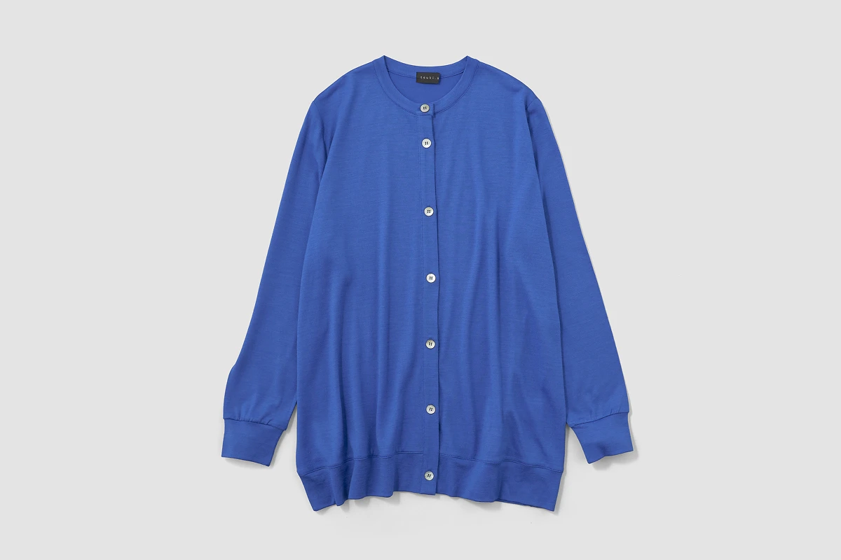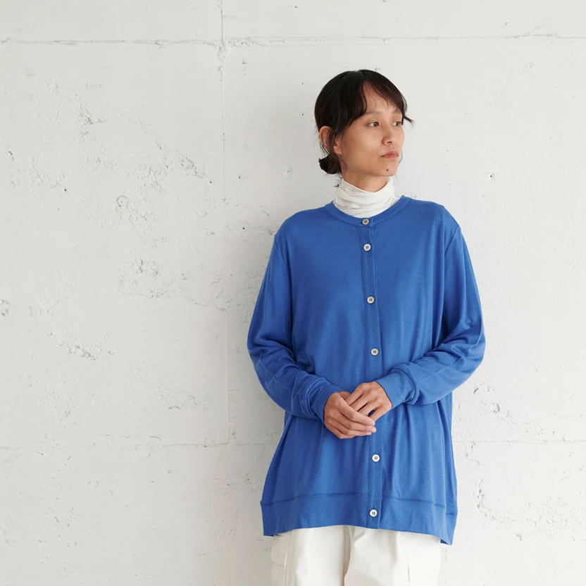身幅も着丈もたっぷりのロングカーディガンですが、 羽織ると軽く、落ち感があるので ストンときれいなシルエットをつくってくれます。 薄手なのにあたたかいから、 わたしはコートのライナーがわりに着ることも。 一番上のボタンだけ留めてAラインを楽しんだり、 全部開けてカジュアルに着ても◎。 軽いので、さっと肩にかけるのもおすすめです。