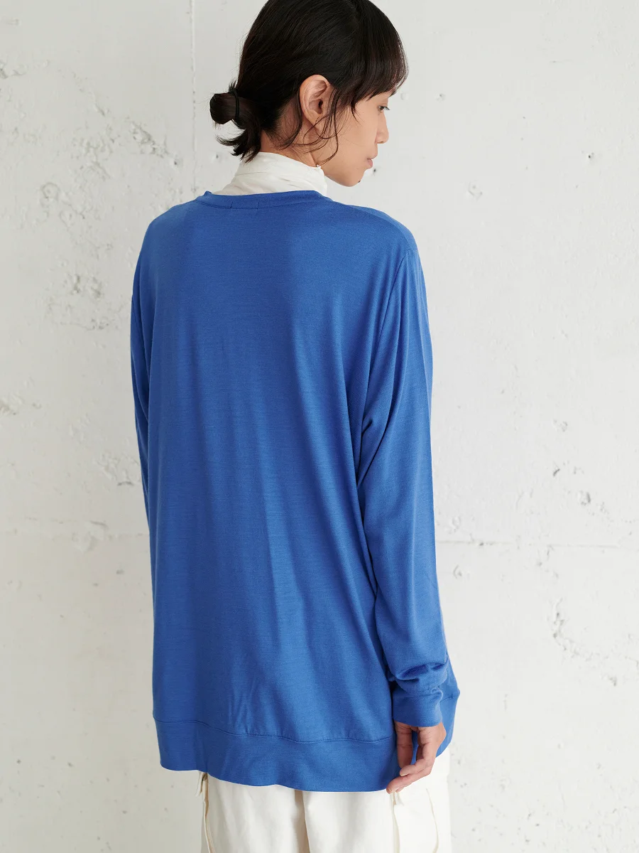 とても細番手の糸の天竺編みなので、 キメが細かく編地にツヤがあり、見た目も上品。 長い繊維のメリノウールを使っているので、 ウォッシャブルだけどあまり毛羽もなく、 糸も甘撚りなので やさしくやわらかな肌ざわりです。