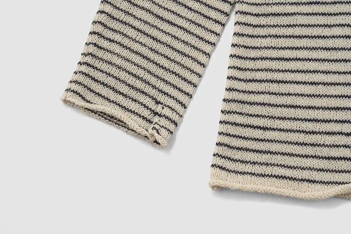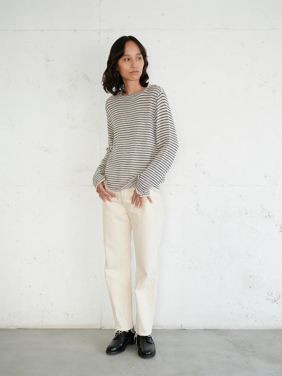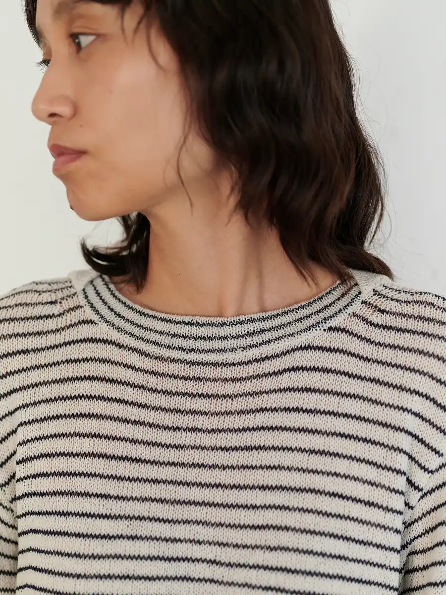 襟は、わたしの好きなボートネック。 編地のテンションがややゆるめなので、 襟元はきっちりダブルにして、 ゆるめのリンキング(1目1目を合わせて チェーンステッチのように縫製する方法)で仕上げています。