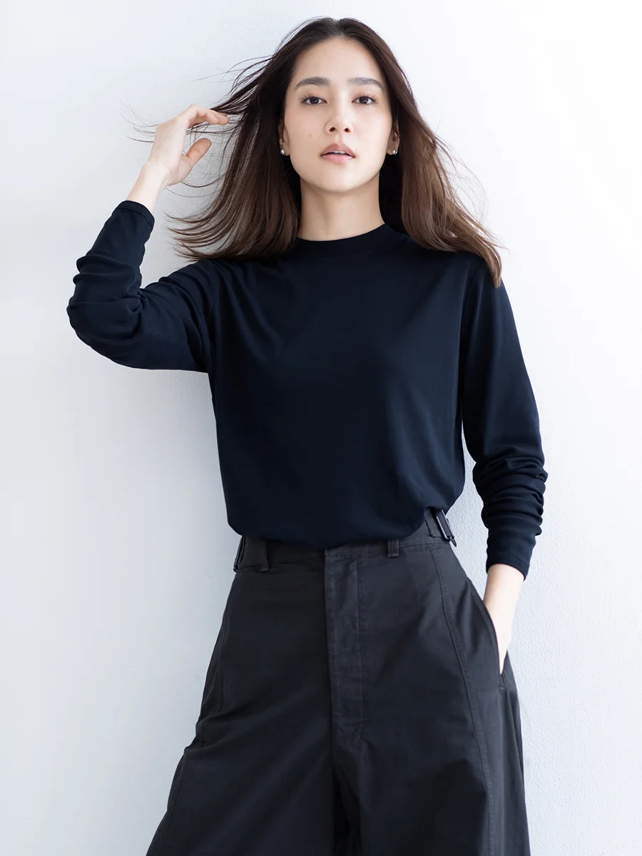 ─ この秋冬も、佐伯さんといっしょに 3つのアイテムをセレクトしました。 まず、昨冬に登場して大変好評だった 「ハイブリッドラマ4」を使った スムース編みのクルーネックプルオーバーが再登場。