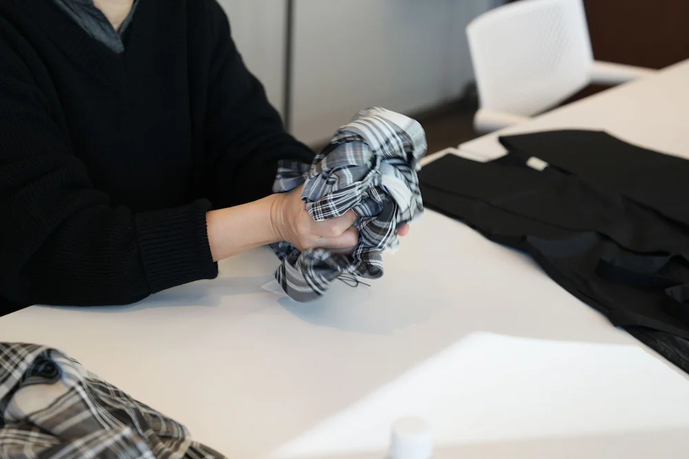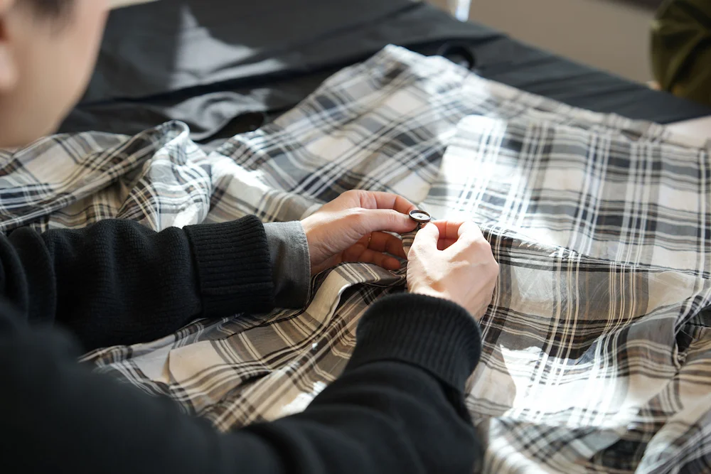 浅川 それはそれでかっこいいのですが、 今回は気軽にバッグに入れて、 旅行にも持っていけるようなラフな一着にしたかったので、 やわらかくて優しい風合いになる ウィメンズウェアの縫製工場にお願いしました。 あと、こういう薄い生地は、 ウィメンズウェアの工場のほうが 縫い慣れていて、得意なんです。 メンズ工場によっては、取り扱えないところもあります。