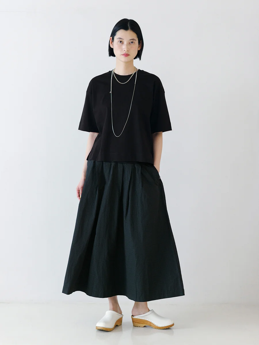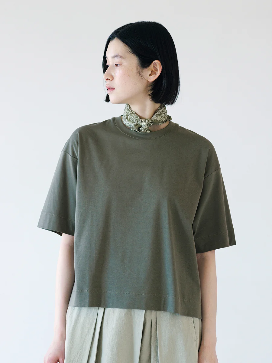 宇和川 スカートでもパンツでも、 どんなボトムスにも合う形ってなんだろう? そんなオールマイティなTシャツを目指して、 着丈はやや短めに、 身幅はRosyのレディースラインのなかでも いちばんワイドに。 裾をボトムスに入れずに着ることを前提にした一枚です。