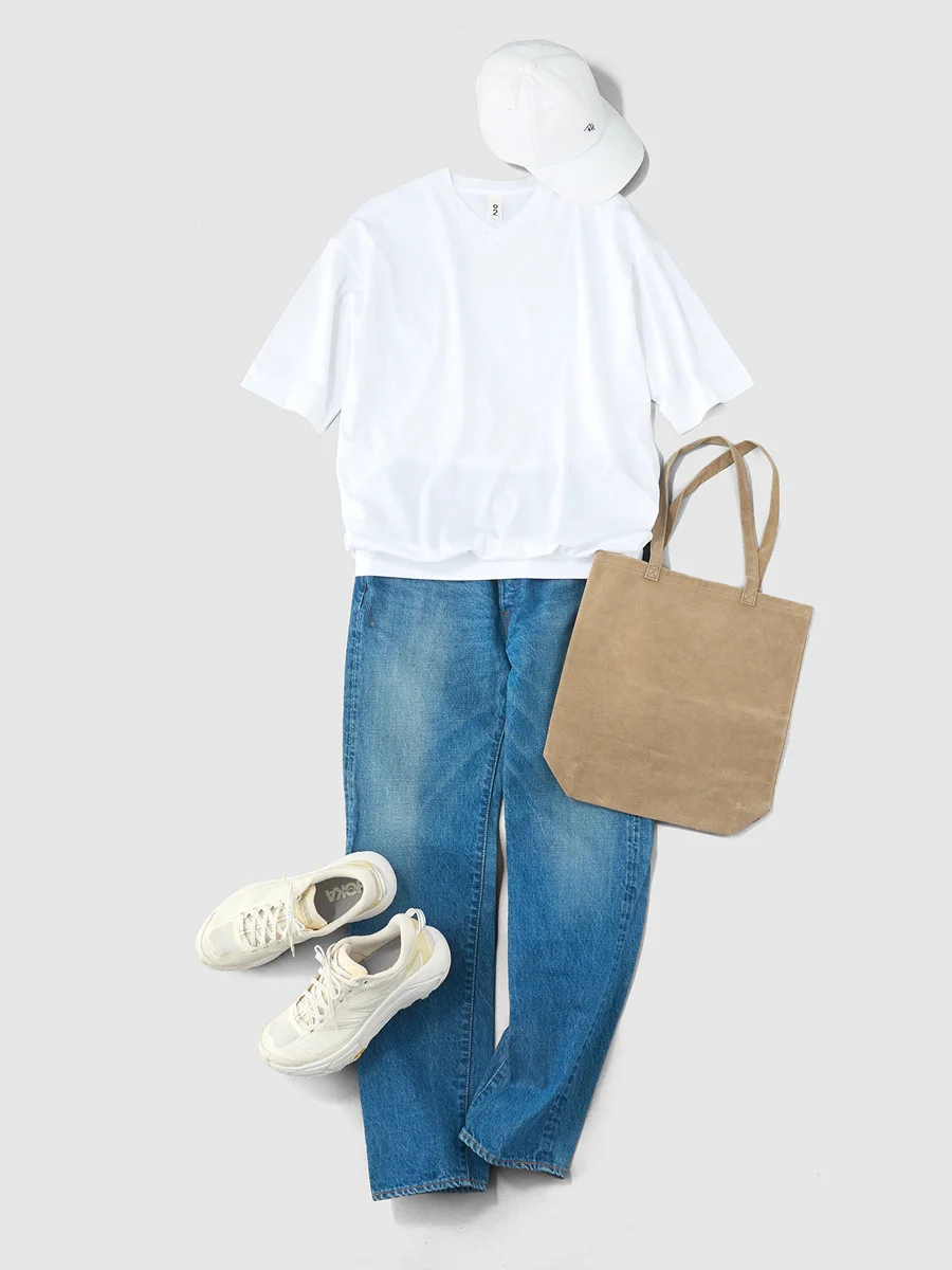 加藤 「味のある大人になったら、 白Tに、使い込んで色落ちしたジーンズ、 そして白スニーカーで過ごしたい」 どの年齢のときも、ずっと目指し続けているスタイルです。 シンプルだからこそ難しくて、 シンプルだからこそ、似合ったら最高に格好いい。 そんなコーディネートだと思います。 Vネックというさりげないポイントが加わることで、 ほんのりこなれた印象に。 バッグも、スエードなど上質な素材を選ぶと、 ぐっと大人っぽさが引き立ちます。 休日の、天気のいい日に。 ふらりと散歩に出かけたくなるような、そんな装いです。
