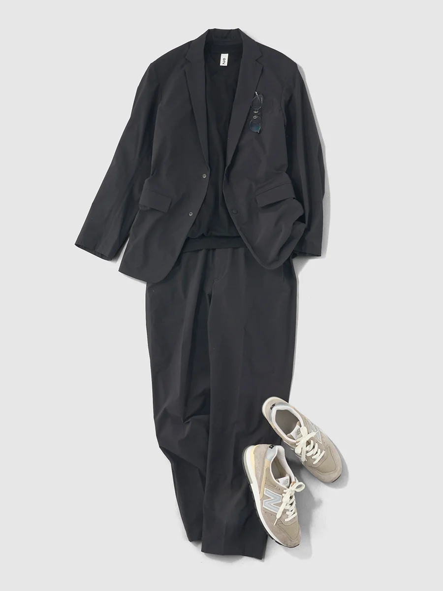 加藤 きりりとしたブラックには、 同色のスーツを合わせてみました。 きちんとしたレストランに行くような場面なら、 革靴を合わせて足元までオールブラックにするのも 格好いいと思います。 ただ、今回のようにグレーのスニーカーを差し込むと、 決めすぎず、ほどよい抜け感が生まれます。 インナーにVネックのTシャツを合わせれば、 ジャケットを脱いだときにも きちんとした印象を保てるので、 仕事の場でも取り入れていただきやすいと思います。