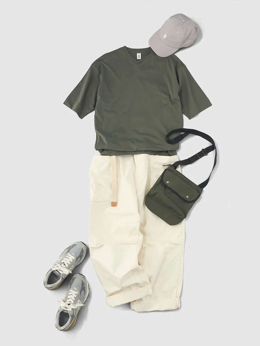 加藤 街ではもちろん、キャンプやバーベキューなど、 アウトドアのシーンにも似合うコーディネートです。 オリーブは、ミリタリーパンツと合わせると 雰囲気が強く出すぎてしまうので、 アイボリーのような白系のワイドパンツを選んで、 ぐっと爽やかな印象に仕上げました。 Rosy特有の上質な素材感のおかげで、 カジュアルな装いでも 自然と清潔感が出るのがいいところです。
