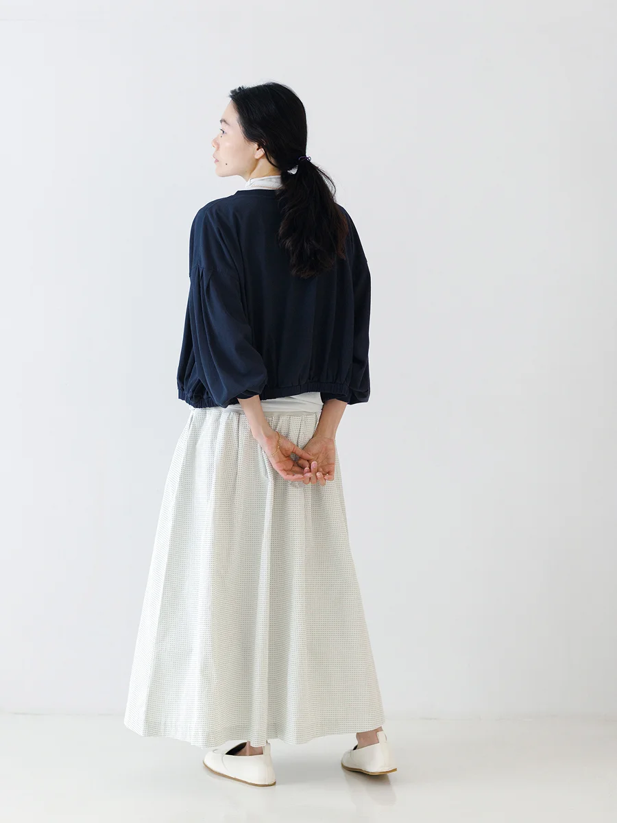 宇和川 サマーパフカーディガンは着丈がコンパクト。 ワンピースのような 長さのあるアイテムと合わせても重たくならず、 引き締め役になってくれます。 このミッドナイトカラーでは、 落ち着いた雰囲気を活かして、 よそ行きのスタイルをつくってみました。 同系色の柄のワンピースを合わせて統一感を出しつつ、 シルバーで透明感のあるアクセサリーを添えて、 春夏らしい涼やかさをプラス。 レストランでのお食事や観劇、コンサートなど、 少し特別な日に着たくなるコーディネートです。