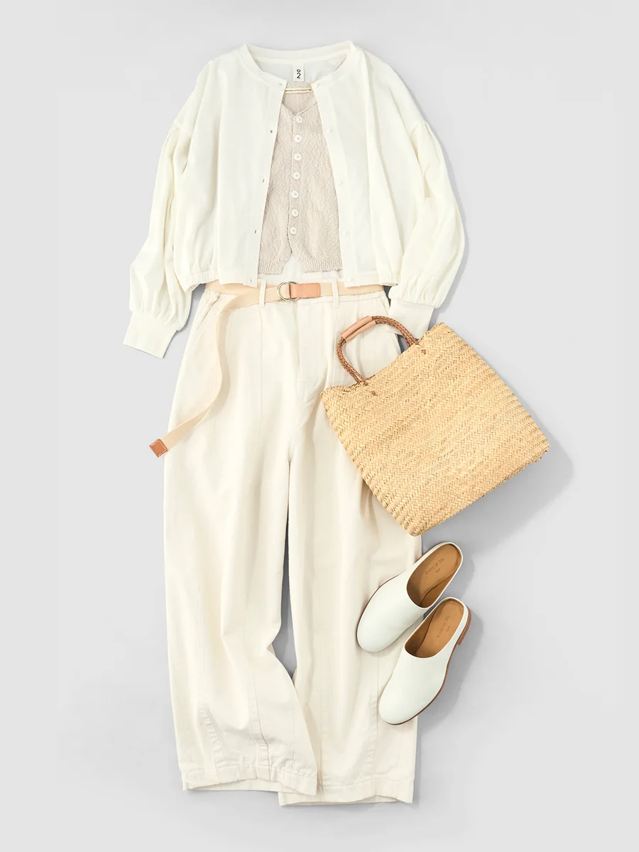 宇和川 オフホワイトは、 ワントーンでまとめるのが好きで、 今回も全体を白で揃えてみました。 ただ、すべてを真っ白にしてしまうと、 少し強くなりすぎるというか、 どこか緊張感が出てしまうので、 少しずつ色味の違う白を重ねています。 視線が留まるポイントがあると全体が引き締まるので、 生成りのベルトを差し込み、 バッグは籠素材にしてニュアンスをプラス。 トップスには、スラブの表情があるニットベストを重ねて、 素材感にも少し変化をつけました。 足元はあえて白の靴で揃えて、 全体の爽やかさをそのまま活かすように。 ショッピングに出かけたくなる、 爽やかなコーディネートです。
