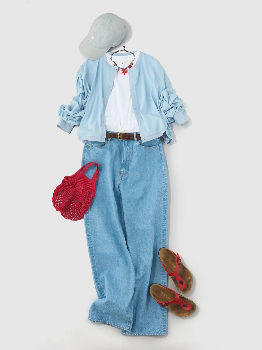 宇和川 この春は、少し色の抜けたデニムが気分で、 清潔感のある淡いブルーを選びました。 ワンウォッシュとは違う軽やかな色味が、 アイスブルーのカーディガンとよく合います。 全体をブルーのトーンでまとめつつ、 差し色に赤を加えて、さりげないアクセントに。 ネックレスはあえて大ぶりのものを選んで、 軽やかな夏の装いに、少しだけインパクトを添えています。 インナーにはRosyのノースリーブを合わせて、 袖は軽くまくり、ラフな印象に。 キャップをプラスすることで、 ほどよくスポーティーさも加えました。 川原をのんびり歩くような、 そんなシーンをイメージしたコーディネートです。