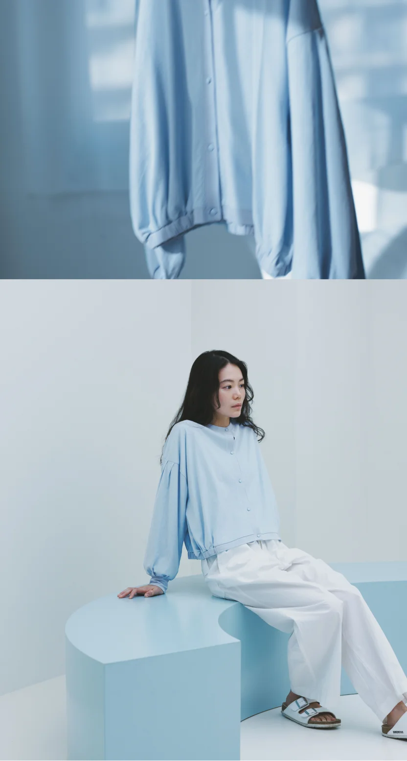 3色それぞれのコーディネートも 宇和川さんに組んでいただきましたので、 着こなしのヒントとあわせて、 サマーパフカーディガンの着心地のよさをご紹介します。
