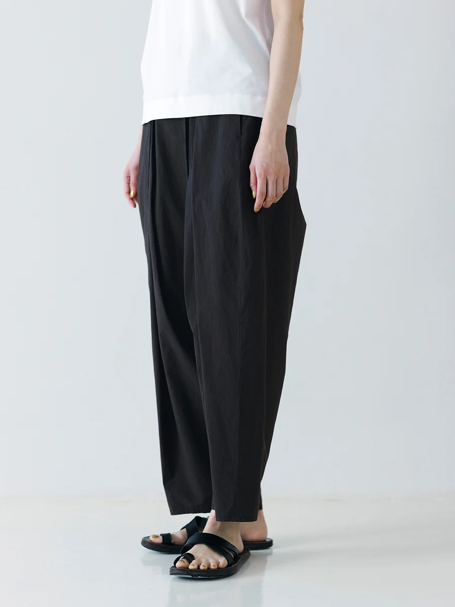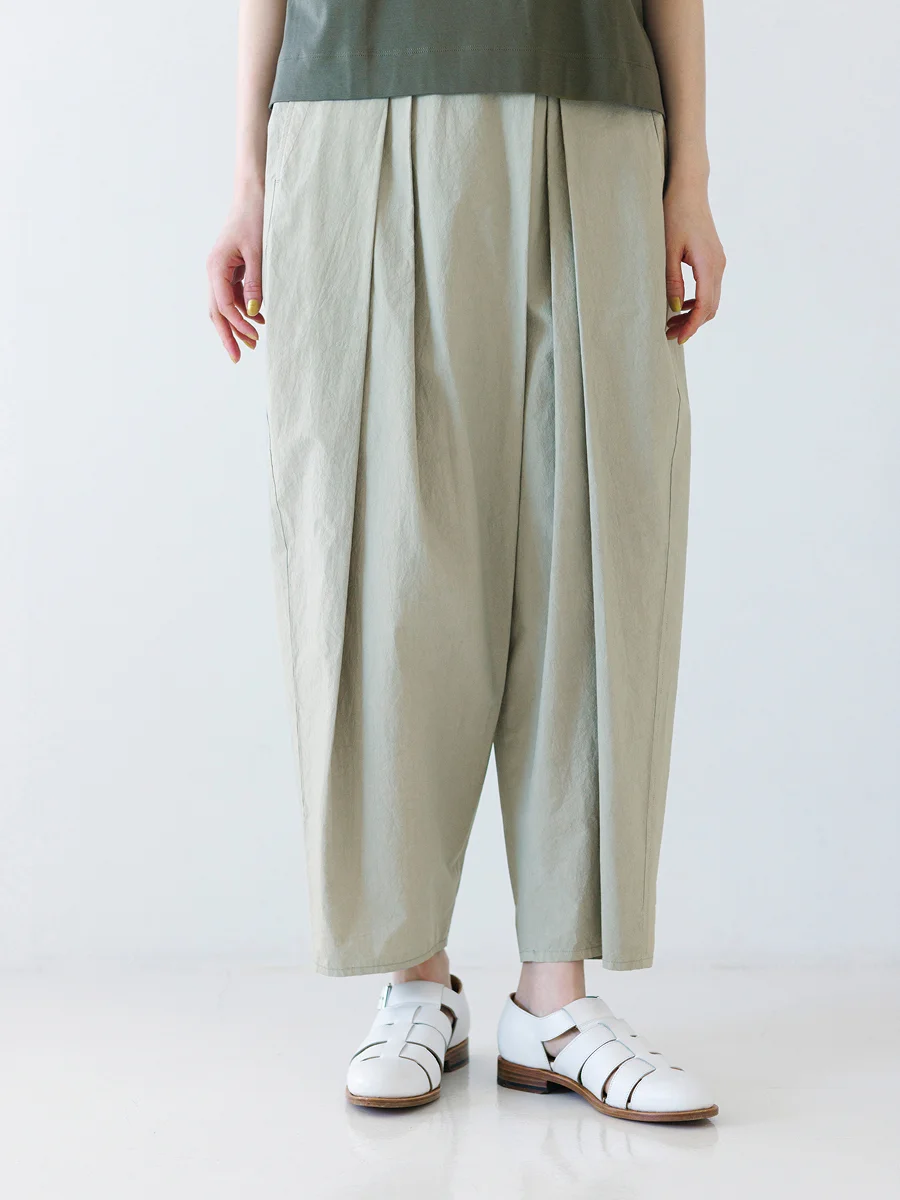 形は、「FACTORY」のロングセラー、 ハカマバルーンパンツ。 さらりとしてベタつかず、シワになりにくい 近江晒加工のコットン地を使い、 自社工場で丁寧に製品染めを施しています。