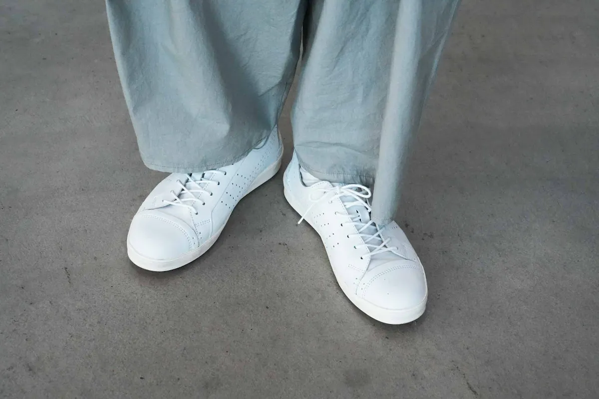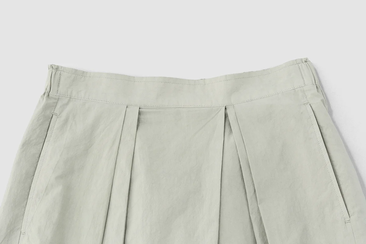 セージは、黒とも相性がいいカラーです。 淡いトーンの中にほどよい締まりが生まれ、 重たくなりすぎません。 足元は軽さのあるスニーカーで抜けをつくると、 黒のトップスを合わせたときも軽やかに見えます。