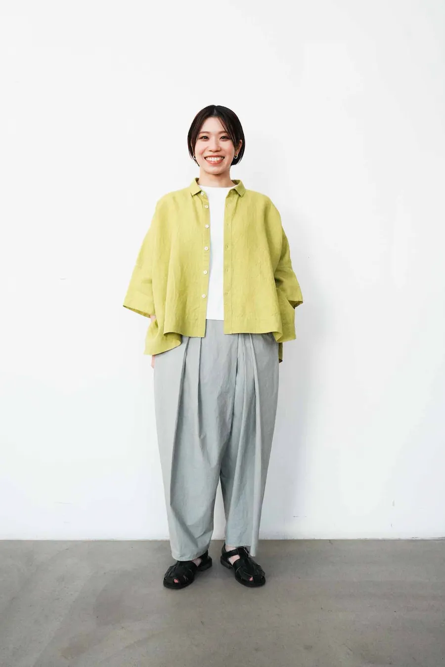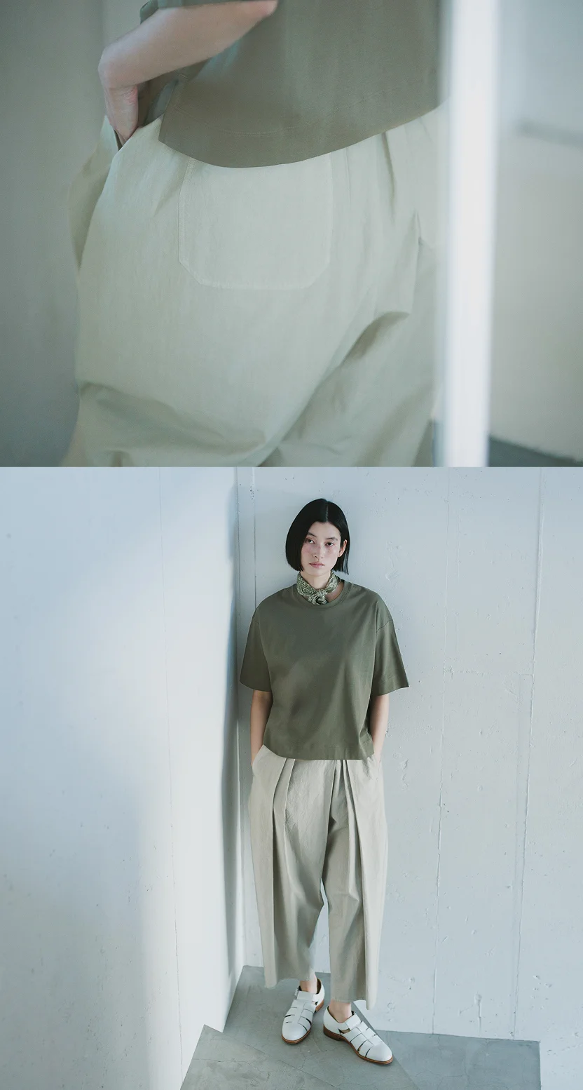 セージのような中間色は、 色数を3つに絞るとまとまりが出ます。 シャツを少し開けて、インナーに白をのぞかせることで、 全体のバランスがぐっと整います。 トップスは明るめの色を選ぶと、春夏らしい軽やかさに。 足元は黒で引き締めても、白で抜けをつくっても。