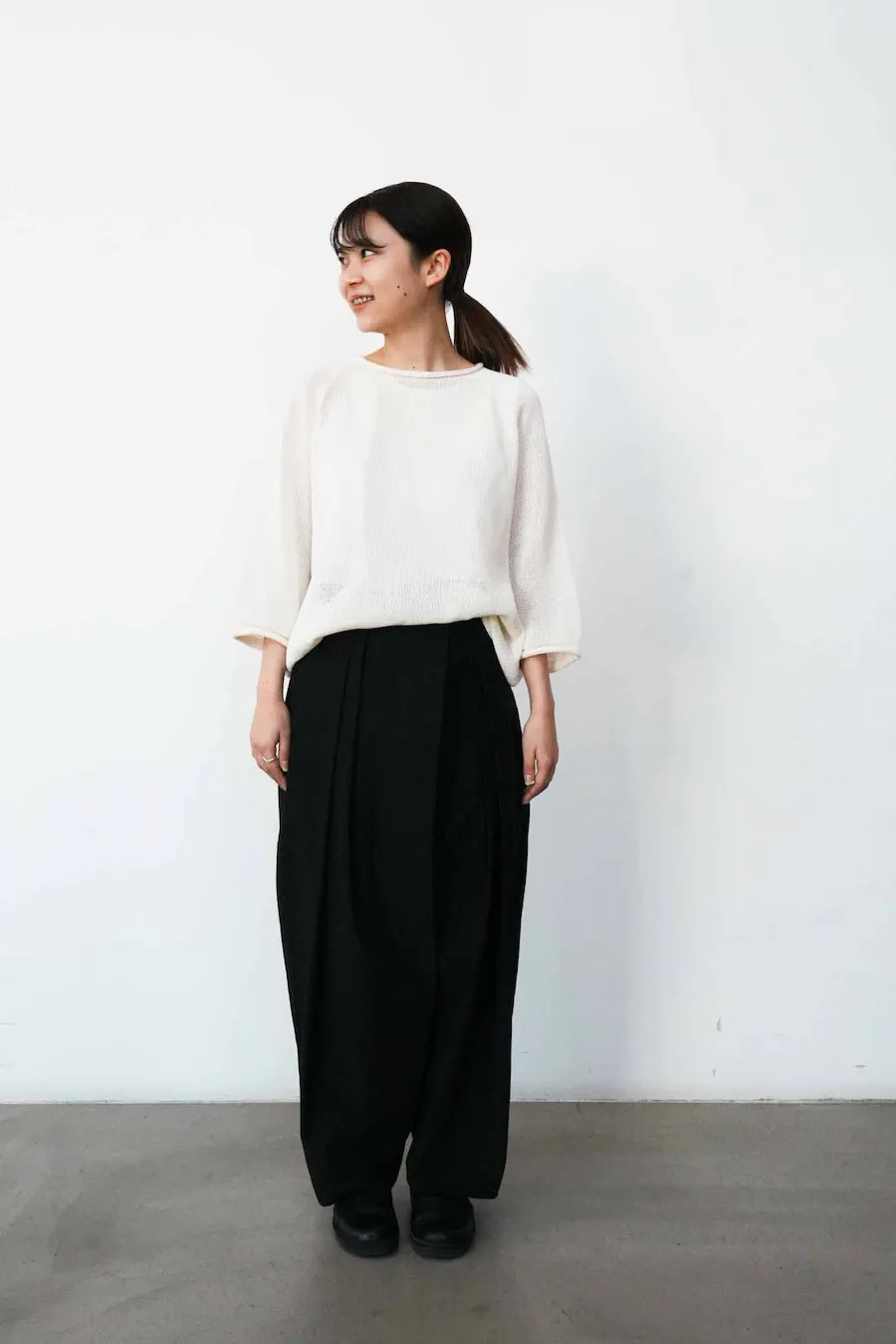 黒は、上に軽さを足すのがポイントです。 白や透け感のある素材を合わせて 抜けをつくると、重たく見えません。 五分袖やロールネックなど、 首まわりや袖に少し動きを出すと、 より軽やかな印象に。